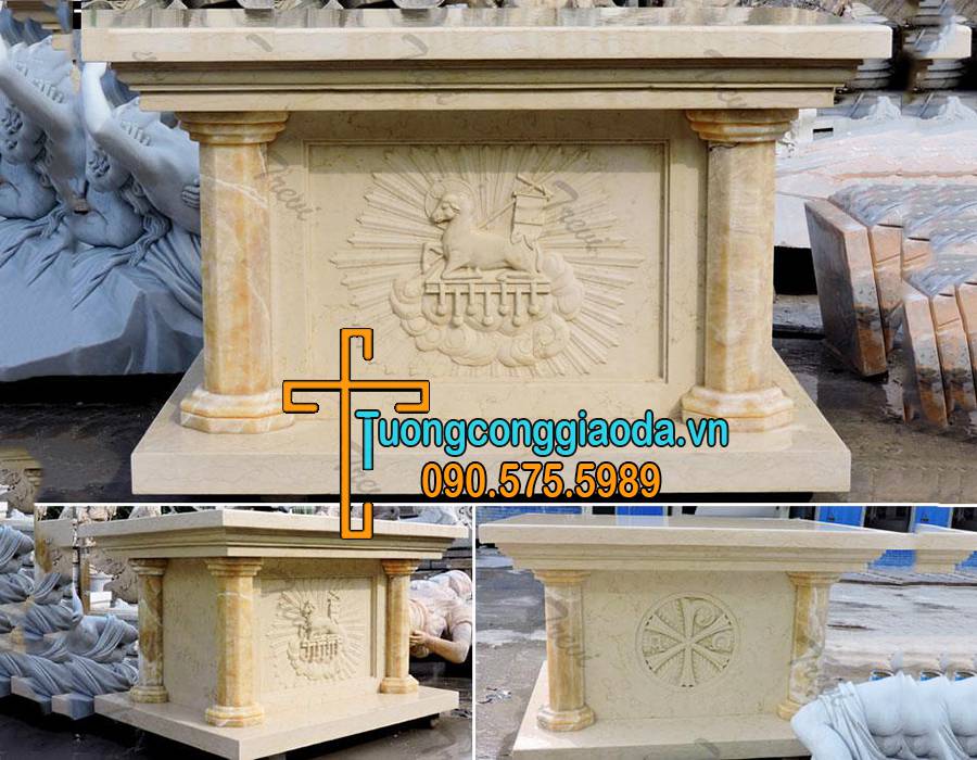 - Mẫu Bàn Thờ Công Giáo Đá Cẩm Thạch Vàng kích thước cao 1m, được hoàn thiện cho khách tại Hải Phòng. Được chế tác từ chất liệu đá cẩm thạch nguyên khối 100%. Điêu khắc Bàn Thờ Công Giáo Đá theo mẫu của khách hàng.